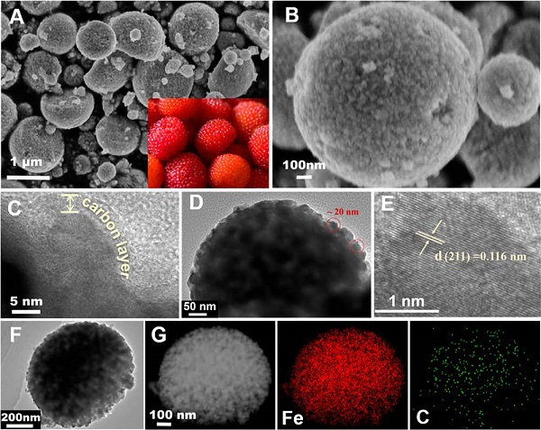 (A, B)CL-Fe@C微球的SEM图像,(C, D, F)TEM图像(插图是图A中的山莓的照片)。(E)HRTEM图像。(G)单个微球的暗视场TEM图像和相应的元素mapping。