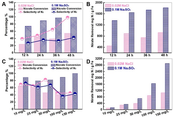 (A-B)不同反应时间下,在0.02 M NaCl体系和0.1 M Na2SO4体系中,CL-Fe@C微球对(A)硝酸盐的转化率和N2的选择性以及(B)硝酸盐的电催化还原能力。(C-D)不同浓度硝酸溶液中0.02 M NaCl体系和0.1 M Na2SO4体系中24 h时(C)硝酸根的转化、N2的选择性和(D)CL-Fe@C微球的去除能力。