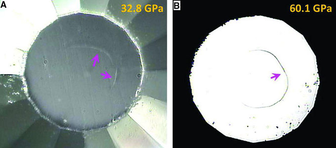 图4. 有序无定形碳簇在钻石砧上留下的环形裂缝压痕