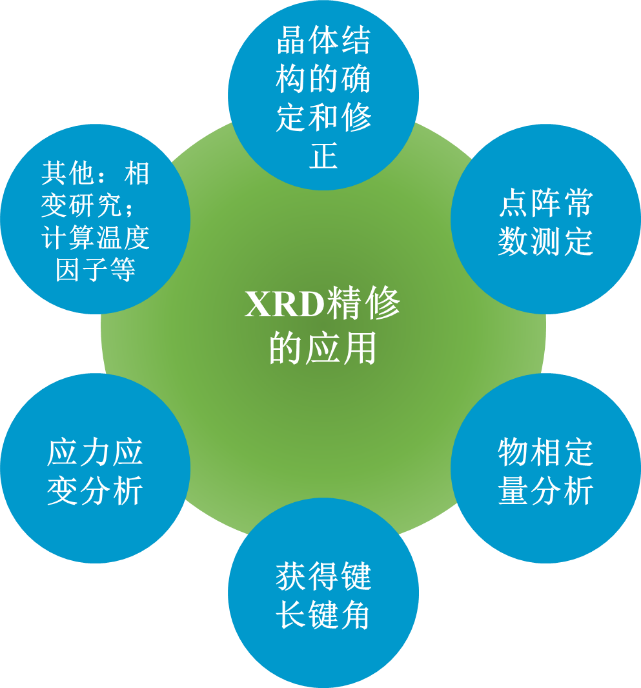 XRD精修的典型应用可以分为如图1所示的六大类:(1)晶体结构的确定和修正;(2)点阵常数的测定;(3)物相定量分析;(4)获得键长键角信息;(5)应力应变分析;(6)其他。