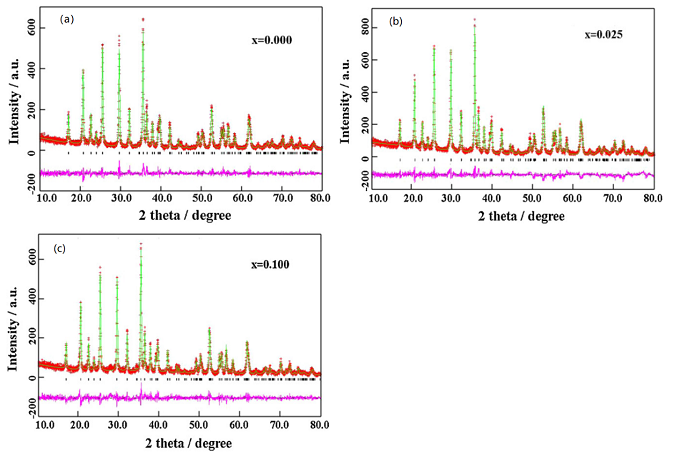 图11 LiFe1–3xMoxPO4/C(x=0.000, 0.025, 0.100)的XRD精修结果