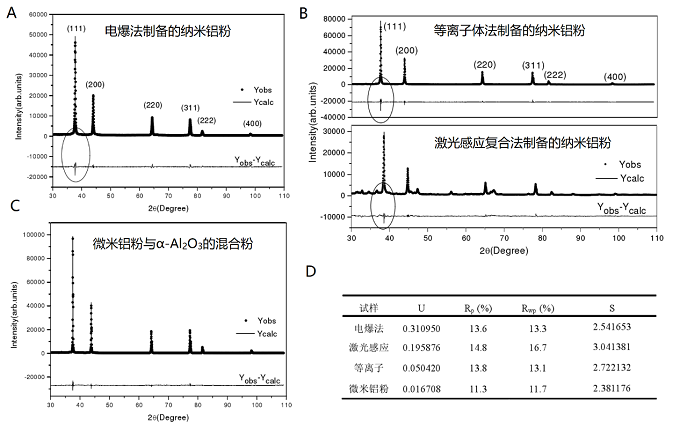 纳米铝粉是一种常用的工业原料。但是,制备过程中的非平衡条件常常会导致纳米铝粉内部产生晶格畸变,从而引起微应力。这些微观应力的存在会直接影响材料的性能,因此对其进行分析就显得很有必要。在本文里,华中HTH官网地址 大学的周玉华就对等离子体法制备的纳米铝粉(Al-P),电爆法制备的纳米铝粉(Al-E)和激光感应复合法制备的纳米铝粉(Al-L)通过XRD精修的方法进行了微应力分析[6]。三种纳米铝粉及对比样微米铝粉的XRD精修结果如图13所示。可以发现,实验谱与理论计算谱基本吻合(图13A-C)。但与微米铝粉相对比,三种纳米铝粉的可信度因子Rp,Rwp和S相对定量分析拟合谱得到的R值相对偏大了3%左右(图13D),主要原因是纳米铝粉晶格畸变比较大,这使得其在(111)晶面衍射峰处的理论谱与实验谱产生了较大的偏差。根据精修结果并结合相关公式,作者计算出了三种样品的微观应变值:电爆法为5.5%,激光感应法为4.4%,等离子体法为2.2%(图14)。这三种样品的微观应变值都比微米铝粉大,且电爆法制备的纳米铝粉具有最高的微观应变值。这主要源于电爆法独特的制备条件,它有着更大的非平衡制备条件,因此晶格畸变更严重,由此产生的微观应力也较大。