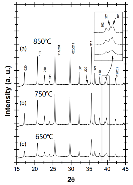 LiFePO4是一种常见的锂离子电池正极材料。它有着170 mAh g-1的理论比容量,价格便宜而且循环性能特别好。通常而言,LiFePO4的合成都需要进行煅烧。然而,不同的煅烧温度可能会对材料的晶体结构产生影响,从而影响材料的性能。韩国Dongshin University的Tae-Hyung Cho等就在三种不同的温度(650,750,850℃)下制备了LiFePO4并基于标准模型通过XRD精修对其结构进行了校正[2]。图4展示了三种样品的XRD谱图。三种样品的最终精修结果如图5所示:它们都符合正交晶系Pnma相,但是三种样品的点阵参数和Fe-O键长却有所不同。这种不同可能是因为随着煅烧温度的变化材料的结晶性或者铁离子价态发生了变化。