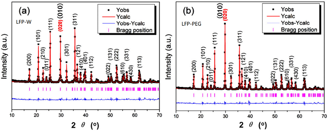 图6 LFP-W和LFP-PEG的XRD图谱精修结果