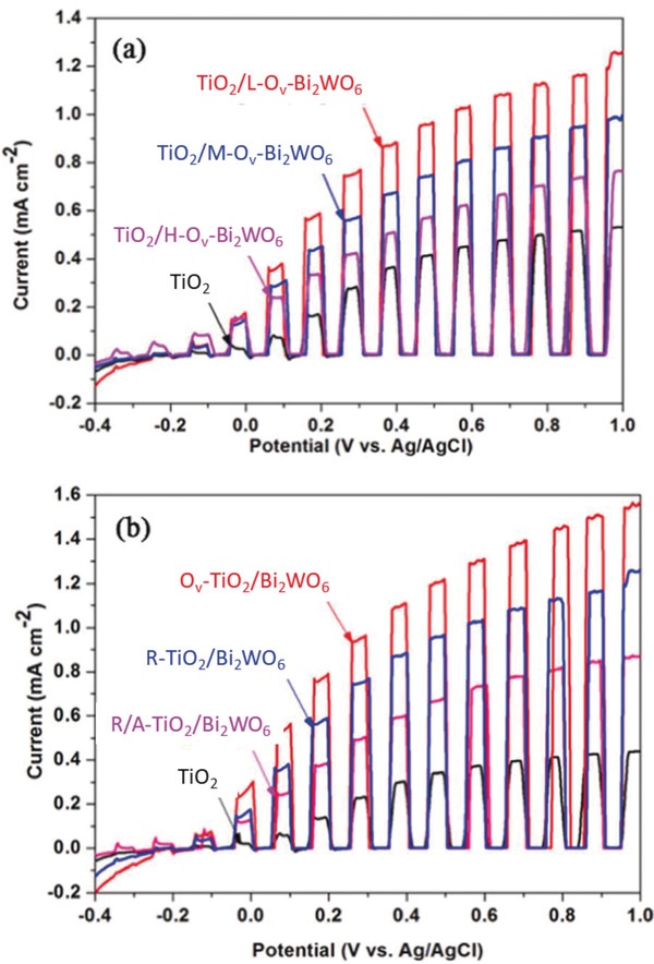 (a,b)Bi2WO6中的本征氧空位和TiO2/Bi2WO6复合电极中的界面氧空位对光阳极的PEC性能的影响。