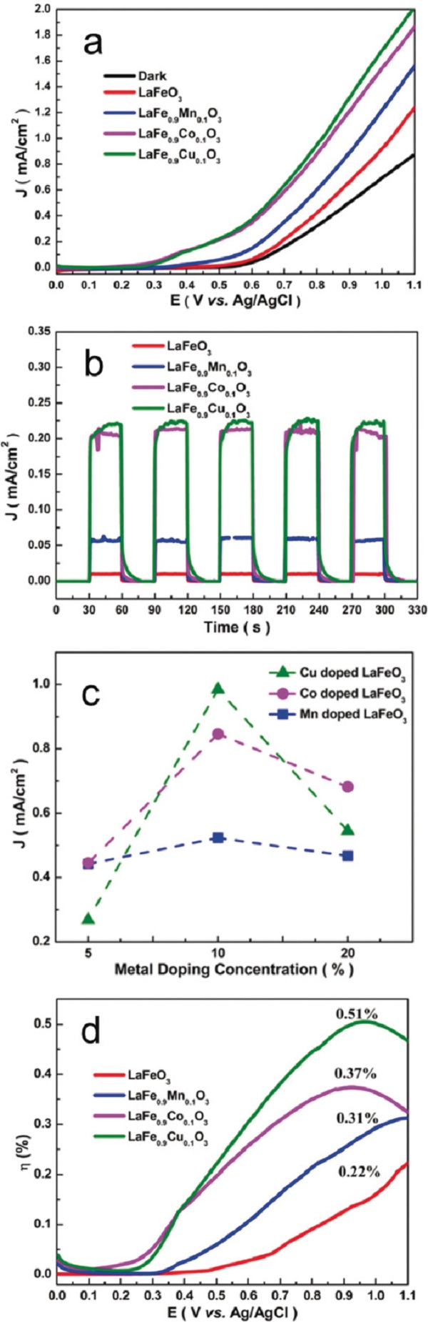 (c)不同掺杂量的Mn、Co、Cu掺杂的LaFeO3的光电流密度;