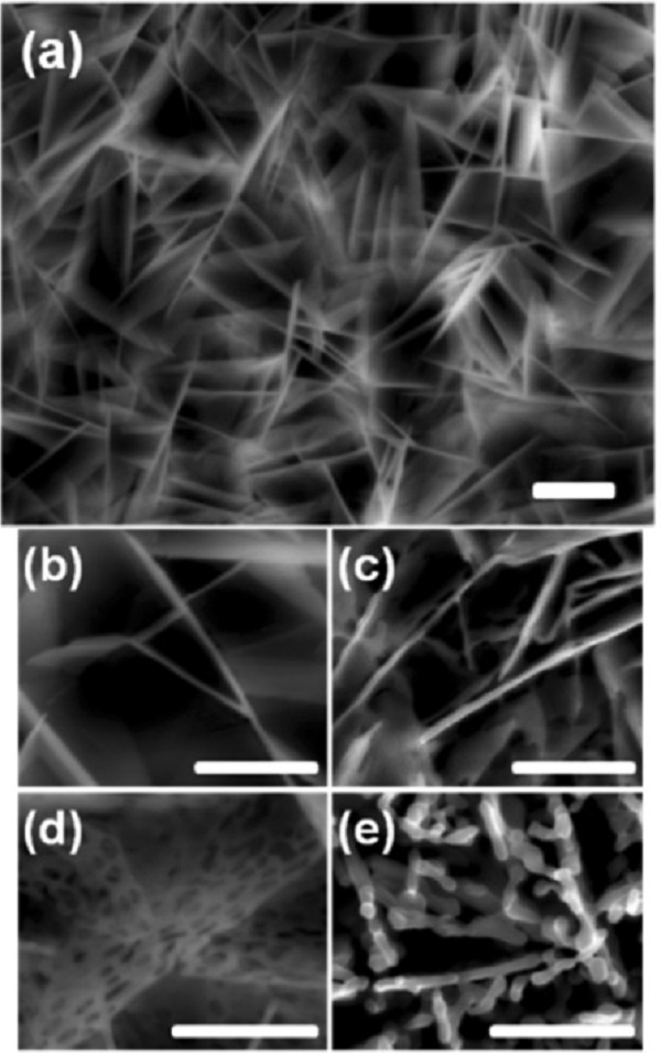 (a)Ba5Ta4O15 和BaTaO2N薄膜不同温度下的氮化后的SEM图像(b)850℃、(c)900℃、(d)950℃和(e)1000℃。