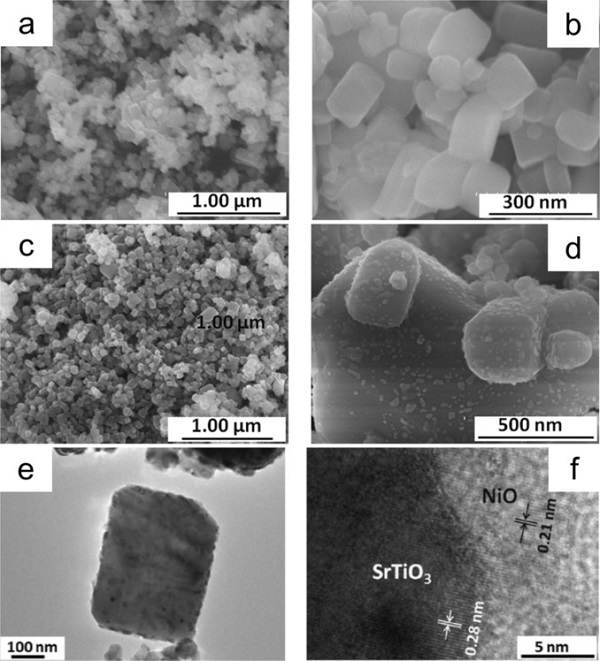 (c-d)NiO@STO纳米颗粒@纳米立方体的SEM图像;