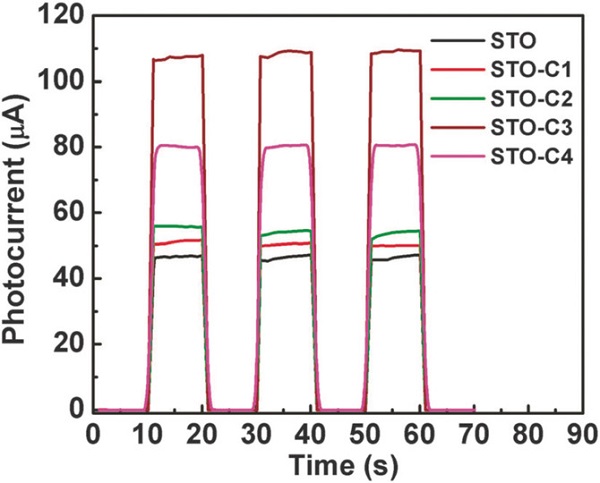图七、在模拟太阳光照射下,STO薄膜和不同沉积时间条件下的CQDs修饰的STO薄膜的I-T曲线(STO-C1:10 s,STO-C2:30 s,STO-C3:60 s,STO-C4:90 s)