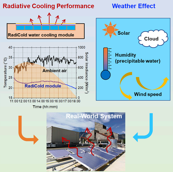 天空辐射制冷(Sky Radiative Cooling)的实际应用需要对系统进行深思熟虑的设计,同时要清楚地了解天气对系统性能的影响。美国科罗拉多大学博尔德分校的杨荣贵和尹晓波教授团队和怀俄明大学的谭刚教授团队合作开发一种在可大规模制造的低成本辐射冷却超材料为基础,探索辐射冷却在天空中的应用。研制了一种辐射冷却-集冷(RadiCold)模块,实现了第一个可全天连续运行的千瓦级辐射制冷系统,并提出了辐射制冷与建筑结合的24h全天连续运行具体方案。试验结果显示辐射制冷模块在白天可将水温降至比环境温度平均低10.6 °C,在夜间可将水温降至比环境温度低约11 °C。并且研究了不同天气条件(风速、可降水量、云量)对辐射制冷性能的影响。对一个5000 m2的商业建筑进行了制冷能耗模拟计算,结果显示针对纬度较低地区的3个不同城市(Phoenix, Houston, Miami),该系统在冬季可以降低64-82%的制冷能耗,在夏季可以降低32-45%的制冷能耗。随着21世纪制冷需求的急剧增加,这项工作为在不久的将来促进辐射式空冷节能、节水和更高效的发电铺平了道路。相关研究以“Subambient Cooling of Water: Toward Real-World Applications of Daytime Radiative Cooling”为题目发表在Joule上。