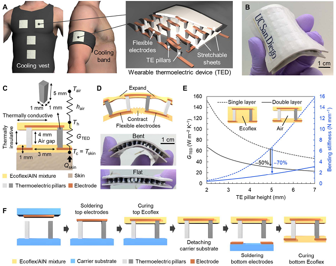 温度调节对能源消耗、人体舒适度和健康有着重要的影响。然而,一个多世纪以来,冷却技术基本上没有改变,而且仍然依赖于整个空间的冷却,而不管居住者的数量。热电装置的个性化热调节可以显著降低制冷量,满足个人的冷却需求,但由于缺少具有可持续的高冷却性能的柔性热调节装置,目前还没有实现。美国加利福尼亚大学圣地亚哥分校的陈仁坤、徐升等研究者展示了一种可穿戴的电子器件(TED),它可以提供超过10°C的冷却效果,并具有很高的性能系数(COP > 1.5)。由于在双层弹性体之间加入刚性无机高热电优值(ZT)的热电(TE)柱,以及空气绝缘绝热层的新颖设计,该TED是第一个实现长期高柔性主动冷却的产品。此外,TED没有使用散热器的情况下,可以达到了10℃以上的大降温效果,为人体热舒适提供了充足的温度调节。将TEDs集成到一件可穿戴的服装中,展示了对人体皮肤的长期、节能的降温和加热效果:当环境温度在22℃到36℃之间变化,衣服可保持皮肤在32℃的舒适温度。与传统的集中空间冷却方式相比,TED和自动化的冷却能力为个性化冷却提供了巨大的节能潜力。基于这些设备的温度调节可以实现从集中式制冷向个性化制冷的转变,从而大大降低能源消耗,提高人体舒适度。这项工作中开发的基于TED的可穿戴服装可能会革新用于建筑物和车辆气候控制的冷却技术。相关研究以“Wearable thermoelectrics for personalized thermoregulation”为题目发表在Science Advances上。