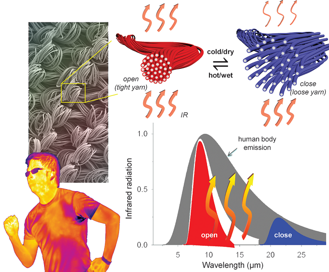 人体主要通过以10um波长为中心的红外辐射吸收和散发热量。然而,无论是我们的皮肤,还是构成服装的纺织品,都无法动态地控制这个光通道来进行热管理。马里兰大学王育煌、欧阳敏团队通过在三乙酸纤维素双晶纤维表面涂覆一层薄碳纳米管的设计制成纺织品,随着皮下相对湿度的变化,可有效地调节35%以上的红外辐射。实验和模拟结果表明,这种动态红外门控效应主要是由相邻涂层纤维之间的电磁耦合引起的。在炎热和潮湿的条件下,织物中的纱线发生变形并紧密地结合在一起,缩小了纱线中导电材料之间的距离,增强了导电材料之间的电磁耦合,产生共振电磁耦合效应,使纺织品的辐射率更好地匹配人体的热辐射,允许红外辐射通过。同时,纱线的收紧直接提高了纺织品的孔隙率,有利于人体和环境之间的对流和蒸发等传统的热交换,协同增强了智能织物的红外辐射“门控”效应。当外界条件变得更凉爽和干燥时,织物中的纱线以相反的方式对环境做出响应,阻挡人体热量的散失。这一效应为开发自主、自供电的可穿戴局部热管理系统开辟了道路,并扩大了我们适应苛刻环境的能力。相关研究以“Dynamic gating of infrared radiation in a textile”为题目发表在Science上。