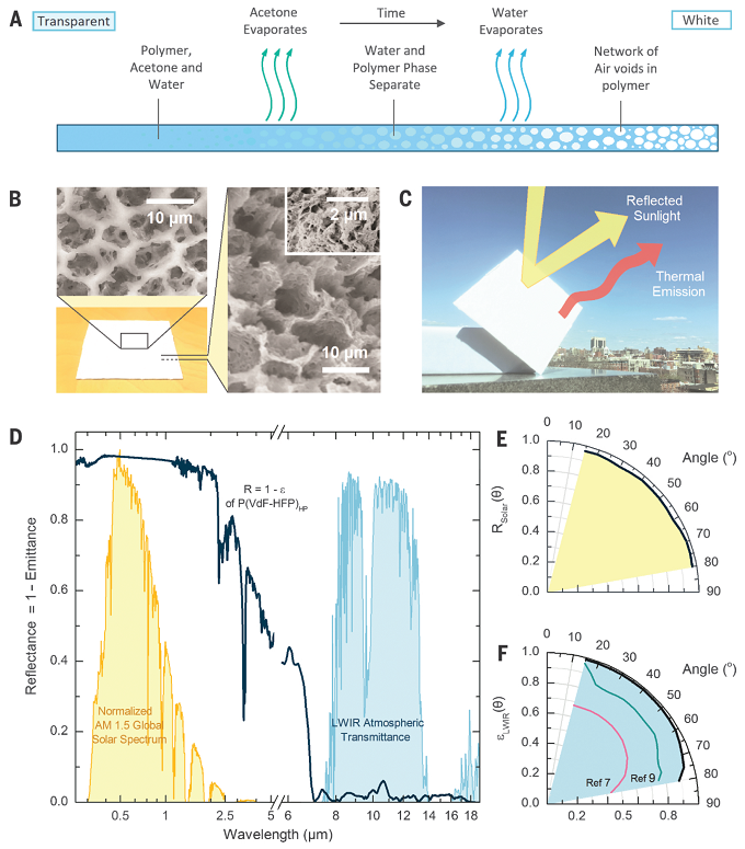 辐射冷却通过反射太阳光和向外层空间辐射热量,自发地冷却表面。目前的设计有望是电气冷却的替代品,但目前的技术要么效率低下,要么适用性有限。美国哥伦比亚大学虞南方和杨远团队报道了提出了一种简单、廉价、可伸缩的多级多孔聚合物:聚偏二氟乙烯-六氟丙烯共聚物涂层的制备方法,可以实现高效的辐射冷却。[P(VdF-HFP)HP]涂层具有优异的辐射冷却性能。高的半球太阳反射率(0.96±0.03)和长波红外发射率(0.97±0.02)允许在太阳强度分别为890和750 W m−2的情况下,涂层使室内环境温度下降6°C左右,冷却功率96W m−2,性能相当于或超过了最先进的辐射冷却设计,并且该技术提供了简单的制备方法。这种多孔薄膜中,聚偏二氟乙烯与空气折射率相差很大,可有效散射阳光,包括紫外光、可见光和近红外光,从而实现高反射率,不会被阳光加热;微米多孔结构提高了材料的辐射率,增加了向外的热辐射。此外,这种涂层可以通过类似刷墙的方式进行施工,对于实际应用极具吸引力。可以采用刷涂、浸涂、喷涂等各种工艺,也适用于金属、木材、塑料凳多种基材。相关研究以“Hierarchically porous polymer coatings for highly efficient passive daytime radiative cooling”为题目发表在Science上。