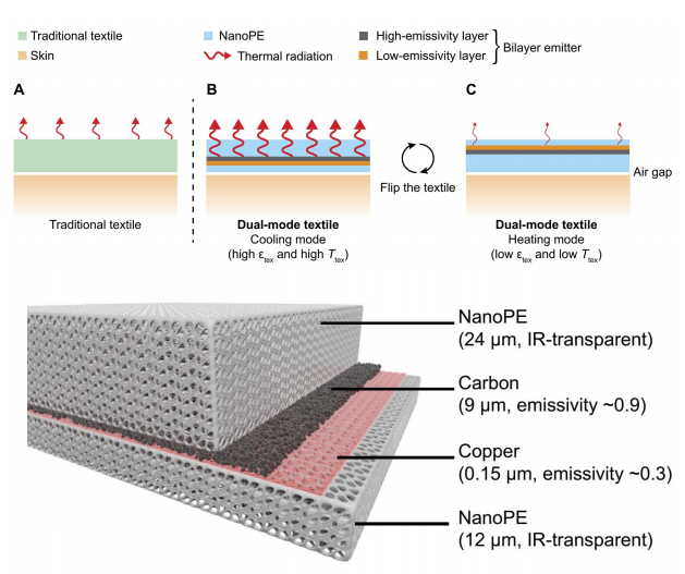 维持人体体温是人类最基本的生存需求之一,维持环境温度恒定往往需要消耗大量的能量。为了在保持人体热舒适的同时,扩大环境温度范围,近年来通过人体红外辐射控制,将个人热管理的概念分别应用于加热和冷却纺织品中。在同一种纺织品中实现这两种相反的功能将是一项令人兴奋的科学挑战和重大的技术进步。斯坦福大学崔屹教授等报道了一种纳米聚乙烯(nanoPE)材料,可作为夏天给人体降温的红外辐射散热织物材料,在不需要任何能量输入的情况下,使用同一块纺织品进行被动辐射加热和冷却。实验结果表明,只需几十微米的薄薄一层,就可以实现被动式的辐射换热,低发射率层朝外时,由于发射率和纳米粒子厚度的不对称特性,可以产生两种不同的传热系数,从而实现低发射率层朝外时的加热和高发射率层朝外时的由内而外的磨损冷却。这项发明的数值拟合进一步预测了双模纺织品舒适区扩大14.7℃之多,从而是人体在很大温度范围内都可以保持舒适。相关研究以“A dual-mode textile for human body radiative heating and cooling”为题目发表在Science Advances上。