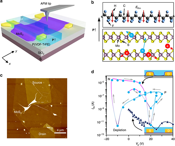 (a) 以AFM针尖作为极化电极对铁电共聚物耦合的MoS2器件进行极化;