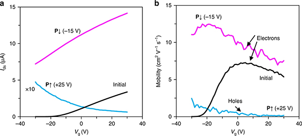 (a) 恒定源漏偏压Vds = 1 V下Si背栅调制的MoS2转移特性曲线,说明MoS2在P↑极化下由初始n型转变为p型半导体;
