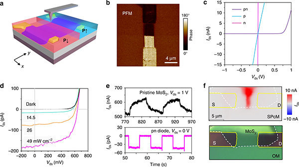 (c) 不同极化图案下(整体p型和n型掺杂、pn结型掺杂)MoS2沟道的I-V特性;