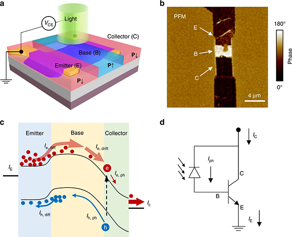 (a) 基于铁电极化图案制备npn双极型光电晶体管的原理示意图;