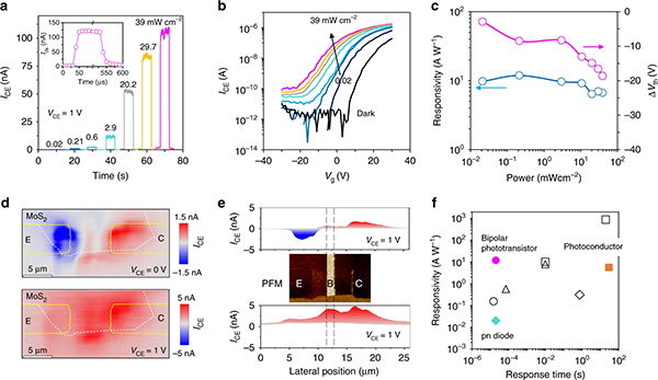 图5 MoS2双极型光电晶体管的光电探测性能表现