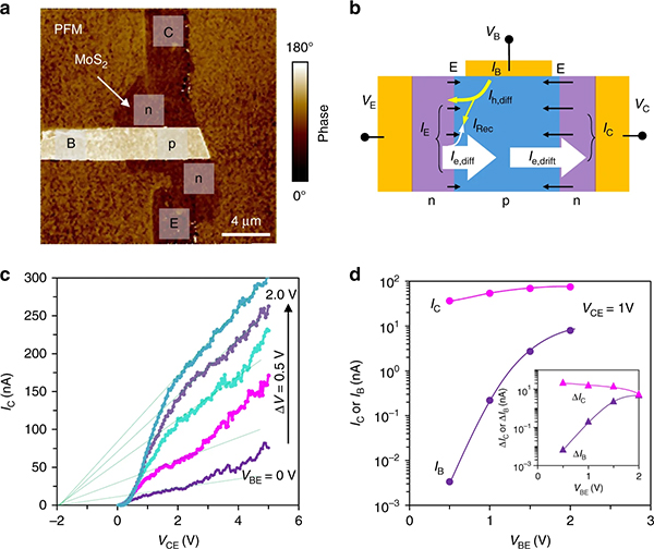 图6 基于铁电极化构建的MoS2 三端npn双极晶体管及其输出放大特性