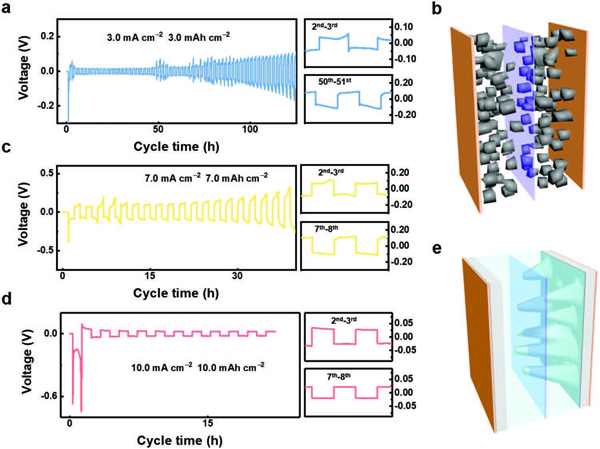 d,e)在3.0mA cm-2/ 3.0mAh cm-2 和10.0mA cm-2 / 10.0mAh cm-2 条件下,金属锂负极失效机制的示意图。(d)中大量形成死锂,电解液被耗尽。(e)中快速短路,电解液大量残留。