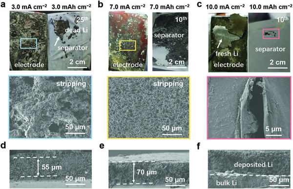d-f)锂电极剥离侧或隔膜SEM横截面图。其中,(a,d)3.0 mAh cm-2,3.0 mA cm-2,(b,e)7.0 mAh cm-2,7.0 mA cm-2,(c,f)10.0 mAh cm-2,10.0 mA cm-2。