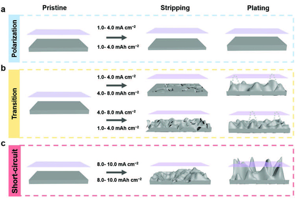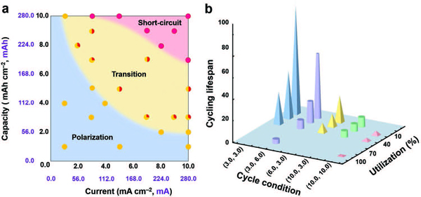 a)不同电流密度和容量下,金属锂负极失效机理图。 过渡区中样品的颜色面积比例表示极化和短路失效的发生概率。