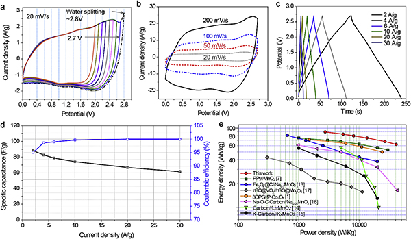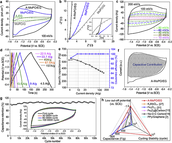 总之,本文提出了一种新型的磷酸钼类聚阴离子型赝电容电极材料,它可以作为高电压水系超级电容器的负极。首先通过简便的电化学方法构建电极,然后利用电化学活化引入更多的氧空位,并扩大晶格,从而加快电荷转移动力学和改善电化学性能。激活的A-MoPO/EG电极显示出优异的电容特性,具有高比电容,良好的倍率性能(4.5 A g-1时为556 F g-1,157 A g-1时为321 F g-1)和超长循环寿命(100 000循环后没有衰减迹象)。该磷酸钼类聚阴离子型电极的电荷存储过程与电解质中的阳离子有关,其可进行多电子转移过程。通过与氧化锰阴极组合,组装的水系不对称超级电容器可在2.7 V的高电压下储能,在2733Wkg-1的功率密度下可提供89.2Wh kg-1的高能量密度。该工作表明聚阴离子化合物在超级电容器领域有很好的应用潜力。