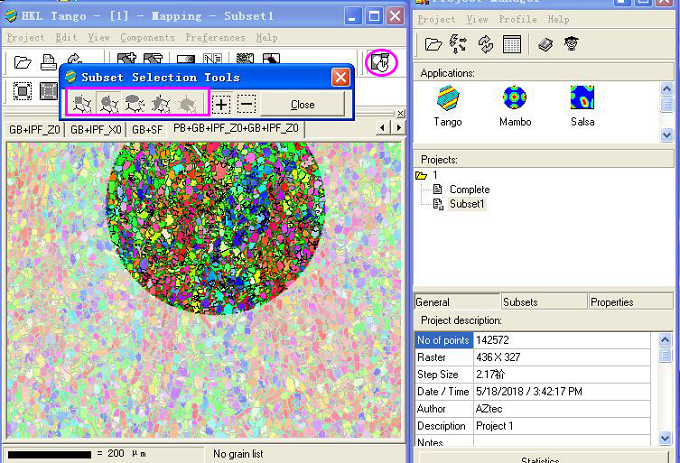 以上是Channel 5软件三个程序最基本的出图,但是在写论文的时候,我们有时关心的是某一局部区域的特征,这便涉及子集选取的功能。Tango、Mambo以及Salsa都有选子集的功能,下面笔者以Tango程序为例,说明Channel 5子集的功能应用。首先,点击分颜色圈的按钮,则出现Subset Selection Tools工具栏,粉色矩形框圈的部分为四个常用的选子集工具,如果读者还需要其他工具的话,点击+号,则出现其他工具。在这里,笔者圆形的工具,在IPF图上的需要区域画个圆,则在右边的源文件部分出现subset 1,表示选取了一个子集。这个子集可以导入Tango、Mambo以及Salsa程序,则可以输出相应的图。Mambo以及Salsa程序的子集选取类似,笔者这里不再一一列出。