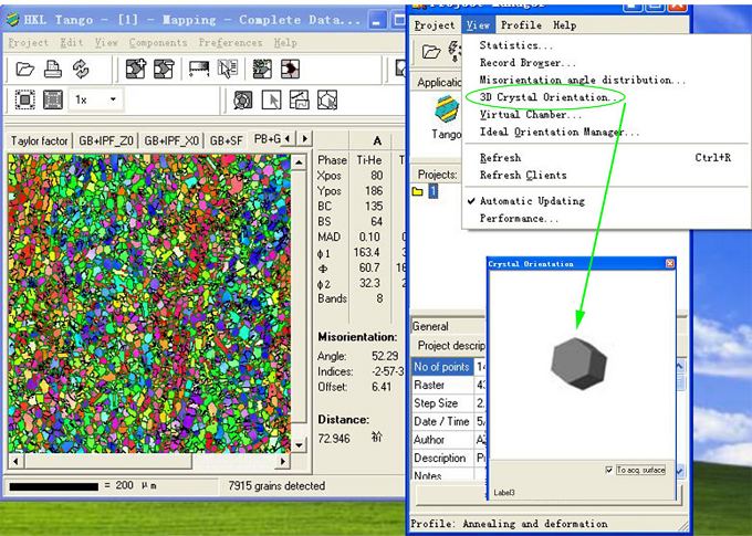 在某些分析中,某些晶粒的3D取向图的加入会使得信息更加丰富和直观,做3D取向图时,如图12所示,首先需要打开IPF图或者Euler图,然后点击View→3D Crystal Orientation,则会出现某晶粒的三维图,在IPF图或者Euler图点击另外的晶粒,则又出现相应的图。