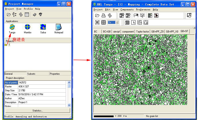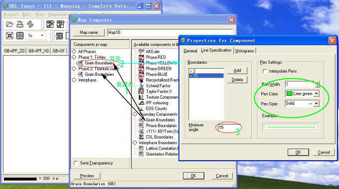 在Tango程序的很多图中,都需要加上晶界,晶界一般用不同颜色的线表示,其设定方法如图5所示。首先把Grains Boundaries拖进相应的相中,双击,会出现右边的对话框,点击Line Specification进行相应的设置。在EBSD中通常把2~15°的设定为小角晶界,15°以上的设为大角度晶界,两种晶界可以用不同颜色的表示,设置位置如图5绿色矩形框所示。相界的设定方法与晶界几乎一样,大家可以比类相知。