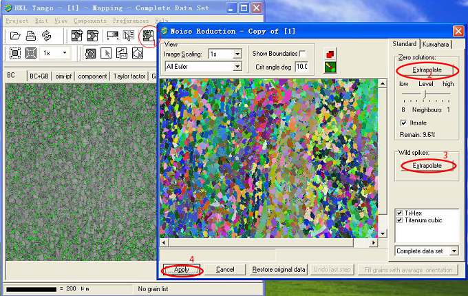 去噪的目的是去除误标的点,提高数据的准确性,其步骤如图3所示:鼠标按照1/2/3/4的顺序点击,即可完成降噪的目的。值得一一提的是在extrapolate下面的按钮表示low→high的一次降噪程度,大家特别注意,降噪需要按照实际情况,不能降太多,也不能太少,太多和太少都会造成数据的失真。