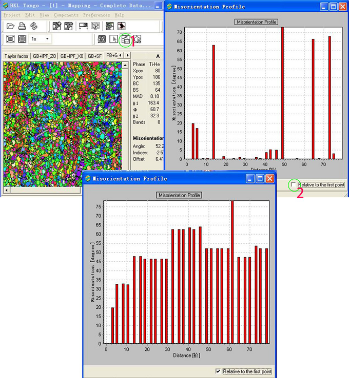 对某个特殊晶粒或者相邻晶粒计算点对第一点和点对前一点的累积取向差时,其步骤可以分为2步,如图7所示。相应点击的按钮皆已标明。