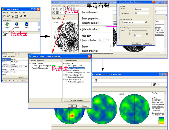 首先将文件拖入Mambo程序中,就会出现右边的对话框,点击红色圆圈标记的按钮,出现箭头所指画面,将Pole figure拖入相应的相,出现散点极图,鼠标右键之后选择New contouring,在粉色箭头所指的对话框这是参数(一般选择系统默认参数即可),点击OK,则出现彩色的极图。反极图,IGMA图的做法与极图的做法类似,不同的是第二步需要把Inverse Pole figure和Axis in sample CS拖入相应的相,接下来的步骤与极图的做法一模一样。