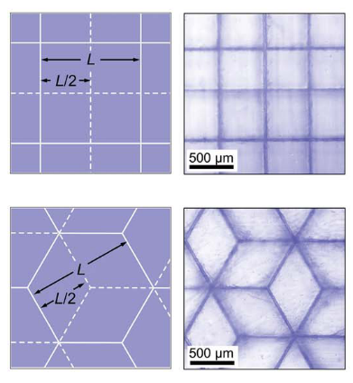 通过改变玻璃板上的雕刻图案,还可以控制每个玻璃“砖块”的形状和尺寸,如六边形和正方形,从而调控其机械性能。