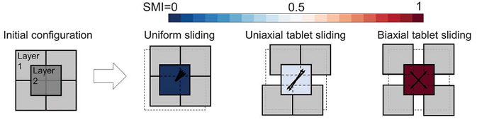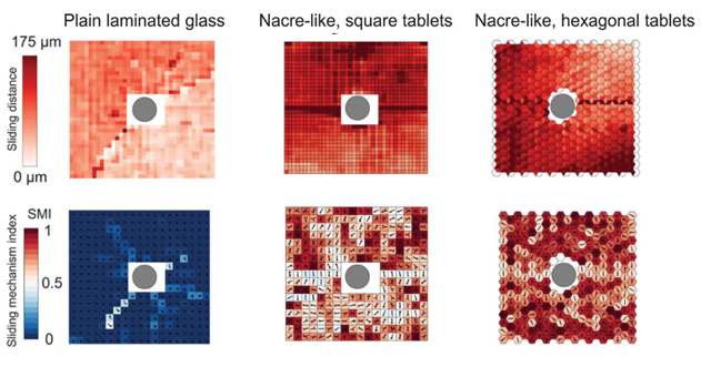 仅仅定性分析还不够,作者更进一步,掏出了更确切的证据——玻璃板的滑动量分布。从底层玻璃板的滑动分布图,可看到珍珠层状玻璃不仅各部位滑动量较大,且滑动量分布也很均匀(相比之下,普通平板玻璃在各个裂纹处的滑动量较大,其他位置滑动量很小)。另一方面,还可确认平板夹层玻璃与珍珠层状玻璃滑动机制上的区别,平板夹层玻璃中各部位产生的是整齐的单向滑动(uniform sliding),而珍珠层状玻璃中的滑动机制与珍珠层结构的滑动机制类似,以各碎块的单轴平板滑动(uniaxial tablet sliding)和双轴平板滑动(Biaxial tablet sliding)为主,充分证明这种珍珠层状的玻璃与天然珍珠层不仅“形同”,而且“神似”,因此能够具有与天然珍珠层类似的高强韧性。