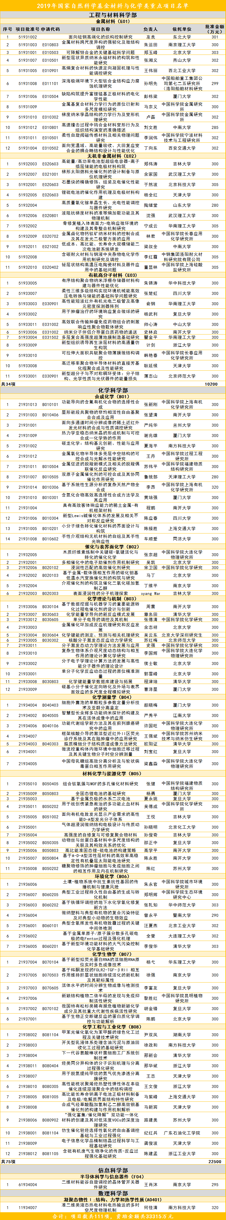 3.3亿元重点项目资金,究竟哪些材料化学类项目获得了支持?Alisa2019-08-22业界4.7K近日,国家自然科学基金委员会已公布2019年获得资助的项目,材料人小编对743项重点项目中的材料和化学部分进行了整理,材料和化学类项目共有111项,获得资助金额超3.3亿元,获得资助的项目情况具体如下图: 本文由材料人编辑整理。 数据来源:http://fund.sciencenet.cn/ 欢迎大家到材料人宣传HTH官网地址 成果并对文献进行深入解读,投稿邮箱: tougao@cailiaoren.com. 投稿以及内容合作可加编辑微信:cailiaorenVIP. 未经允许不得转载:材料牛 » 3.3亿元重点项目资金,究竟哪些材料化学类项目获得了支持?