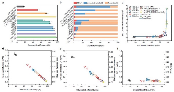 锂金属负极通常能够提供较高的理论容量(可达约3860mAh/g),但是基于此类负极的可充电电池常常会出现枝晶生长以及低库仑效率的问题,对其商品化发展造成困难。一般认为,通过消耗电解质和活性锂金属的固体电解质界面(SEI)连续修复过程是造成库仑效率降低的重要原因。然而,定量研究因形成SEI而造成的容量损失到目前为止还鲜有报道,阻碍着对容量衰减机制的深入研究。