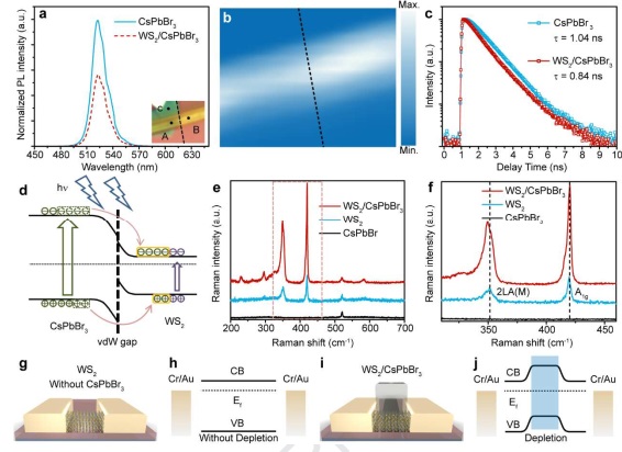(i-j) WS2/ CsPbBr3的器件结构图和能带图,展示出耗尽区的形成。