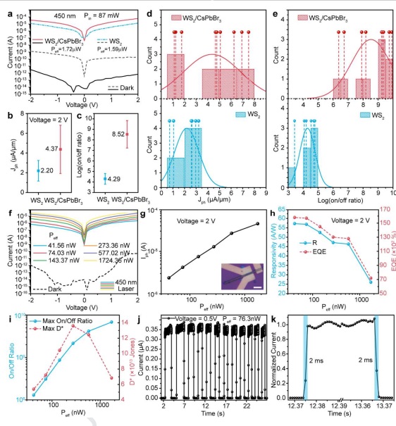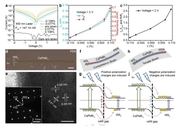 研究者设计了一种新型的WS2/ CsPbBr3-vdWH光电探测器,它具有高性能、低能耗、多功能集成等特点。器件开关比高达109.83,响应度和探测率分别达到57.2 A/W和1.36×1014琼斯。此外,研究者还基于柔性衬底制备了可通过压电光电子学效应调制并且能够探测器件本身所受应变的多功能集成的光电探测器。