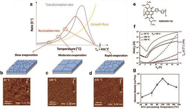 (b~d)不同结晶过程下P(NDI2OD-T2)薄膜的AFM图像;