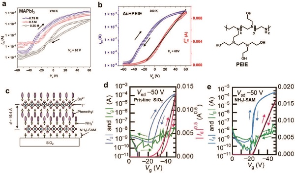 (a)在270 K时,0.25、0.5和0.75 M Pb(Ac)2前体溶液制备的MAPBI3 FETs的转移特性;
