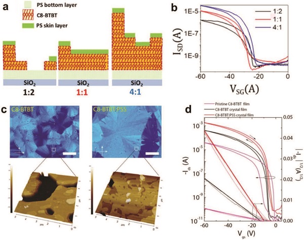 (b~c)用对二甲苯(diX-SR)或聚酰亚胺栅介电层制备的OFETs的转移曲线,其中红色表示有、黑色表示没有几层三氯乙烯膜;