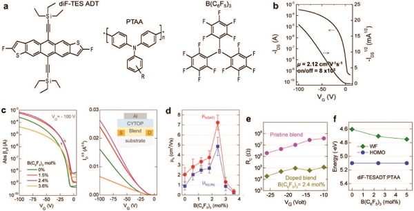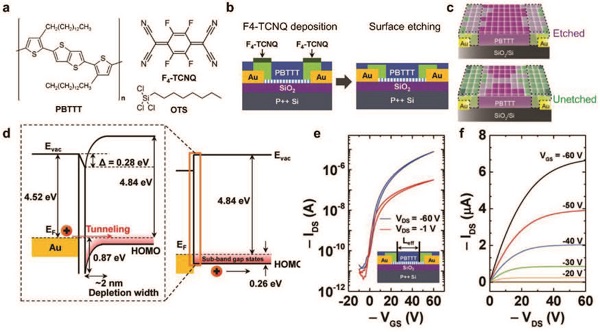 (a)PBTTT、F4-TCNQ、OTS的分子结构;