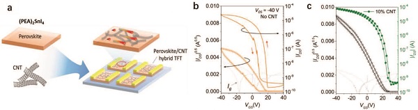 (a)(PEA)2SnI4/semi-CNT 杂化FET示意图;