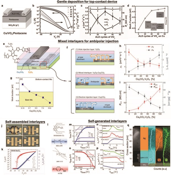 (m、o)具有自生成HEG-DT中间层的n型OFETs的输出特性或具有4-FM夹层的p型OFETs的输出特性;