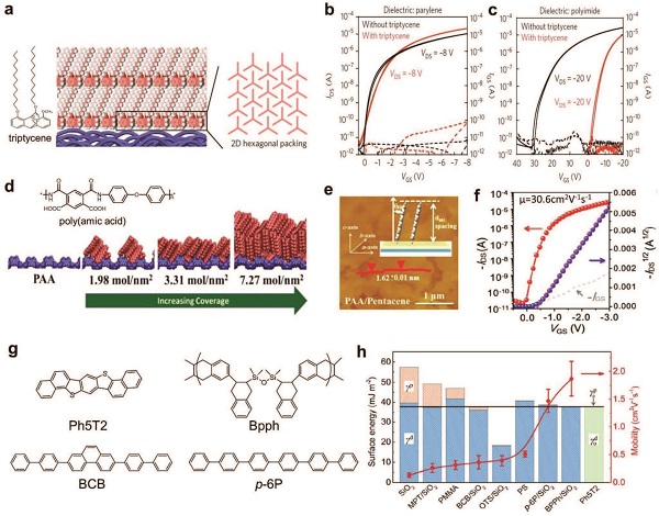 (f)20 nm并五苯OFET的典型转移曲线,器件在饱和区域的迁移率高达30.6 cm2 V−1 s−1。