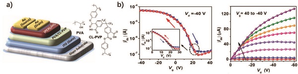 (a)柔性OFET器件的结构示意图以及PAA和PMMA的分子结构;