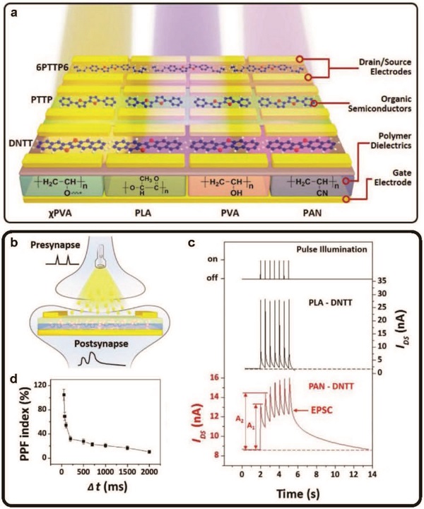 (c)PLA-DNTT-OFET(VG=−20 V,Vd=−60 V)和PAN-DNTT-OFET(VG=−40 V,Vd=−60 V)暴露在输入光突触列中的输出ID信号,光的开启时间为10 ms(p=1 mW cm−2),关闭时间为500 ms。