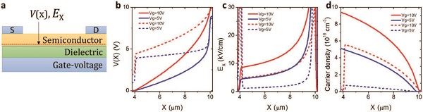 (a)理想OFET中载流子浓度n、漂移电场Ex与理想电流-电压关系的假设;